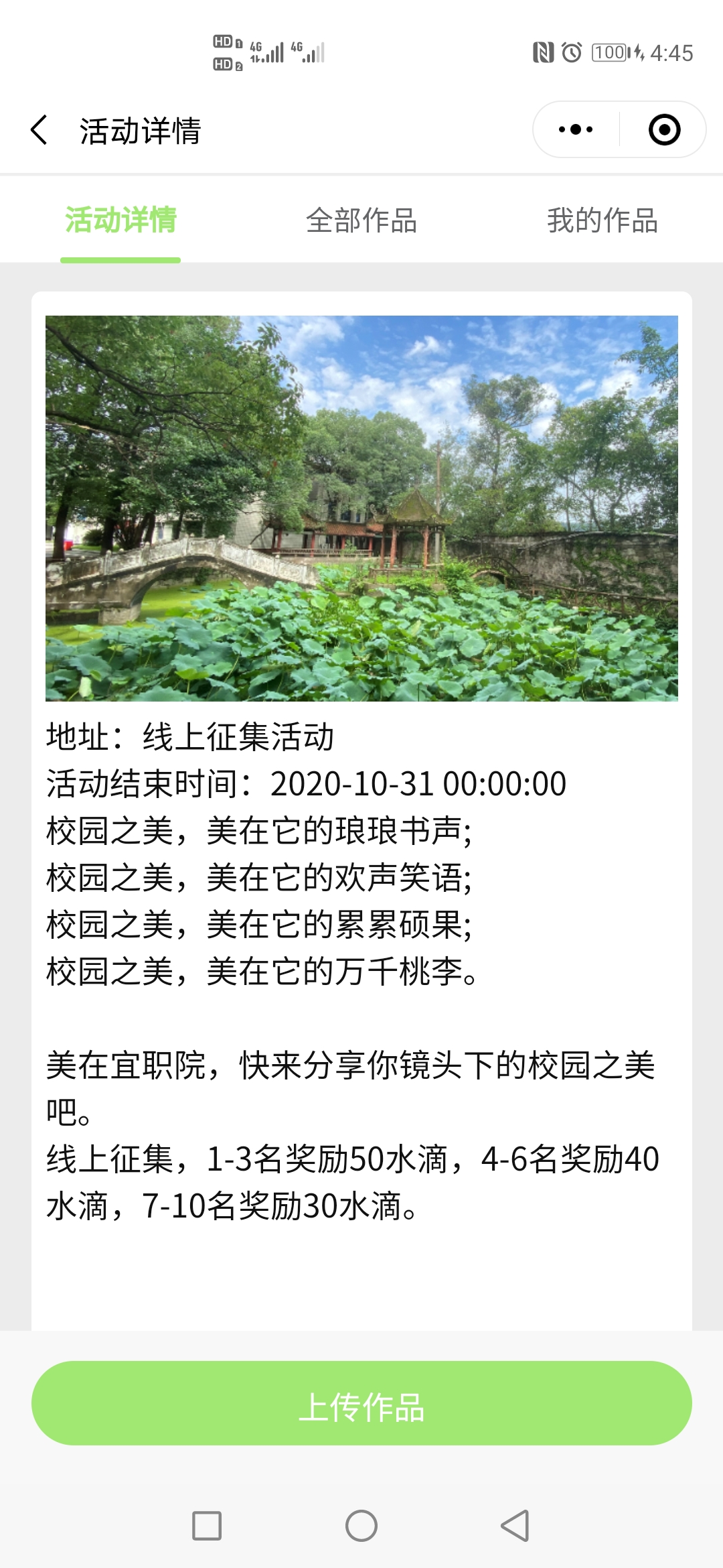 参与方式:活动时间内在活动现场扫码小程序,注册成功后,参与“发现校园之美”线上活动即可获得一次抽奖机会,获奖者可获得绿植盆栽一盆。