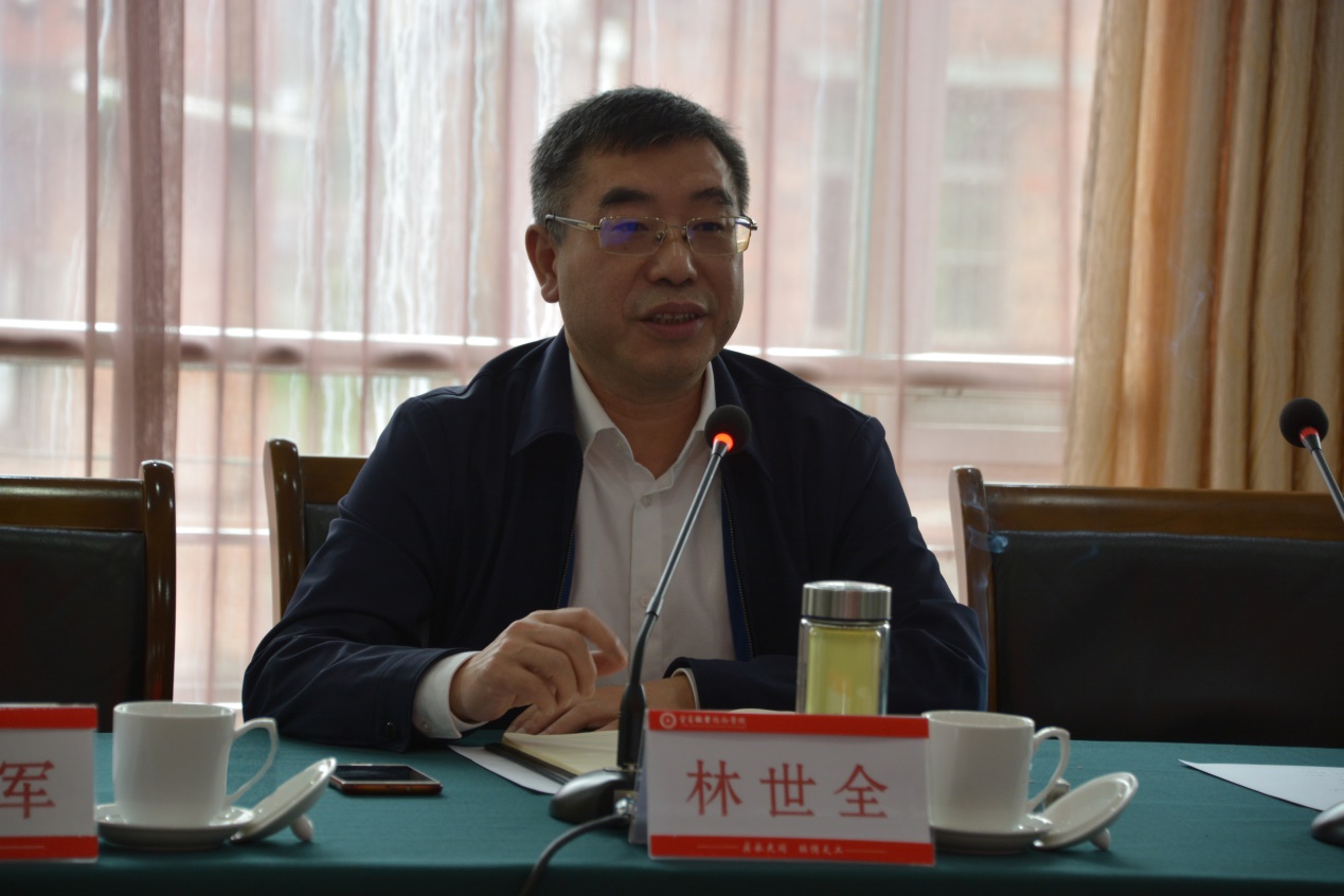 随后,双方在科苑宾馆三楼小会议室举行了交流座谈会。学院党委书记林世全代表学院对王隆毅书记一行的到来表示热烈欢迎,介绍了宜宾职业技术学院坚持深入学习贯彻习近平新时代中国特色社会主义思想和党的十九大精神,紧紧抓住国家、省、市发展战略机遇,服务宜宾如期建成全省经济副中心、争创成渝地区经济副中心、建设全省唯一“学教研产城一体化试验区”以及三江新区。同时,林世全书记就学院党建工作、内涵建设、机构调整、师资队伍建设、产教融合和谋划职教本科等方面作了详细的介绍。