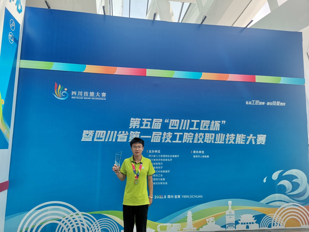 我院2020级学生毛理虎同学经过市级“四川工匠杯”选拔后,作为宜宾市电子技术赛项选手参赛,与来自川渝两地共15支代表队同台竞技,经过两天四个模块的激烈争夺,最终获得电子技术赛项一等奖。