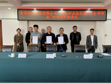 王志刚向舍得酒业产业导师颁发了聘书,闫德民为“舍得酒业”订单班学生分发了订单班物品,并分别代表学校、企业和学生代表签订了三方协议。