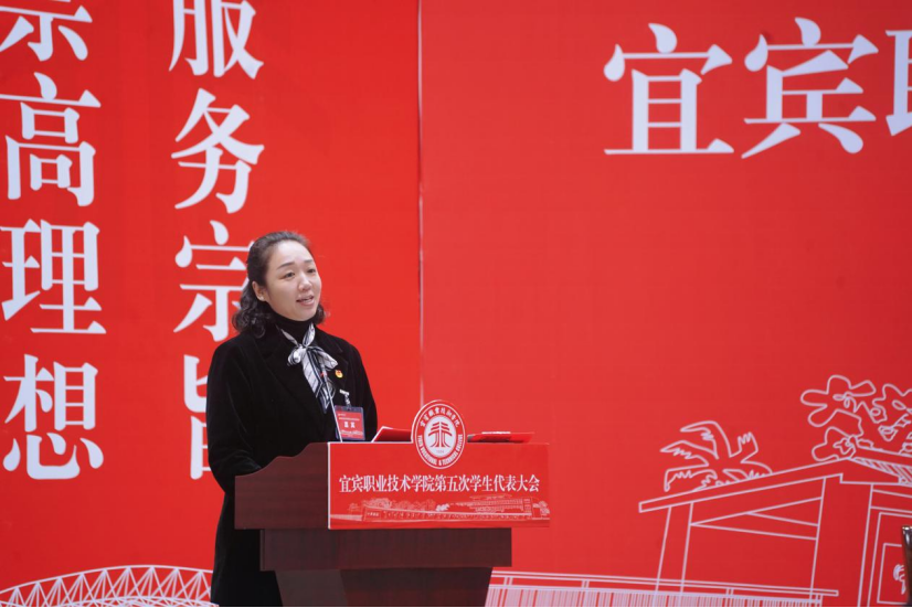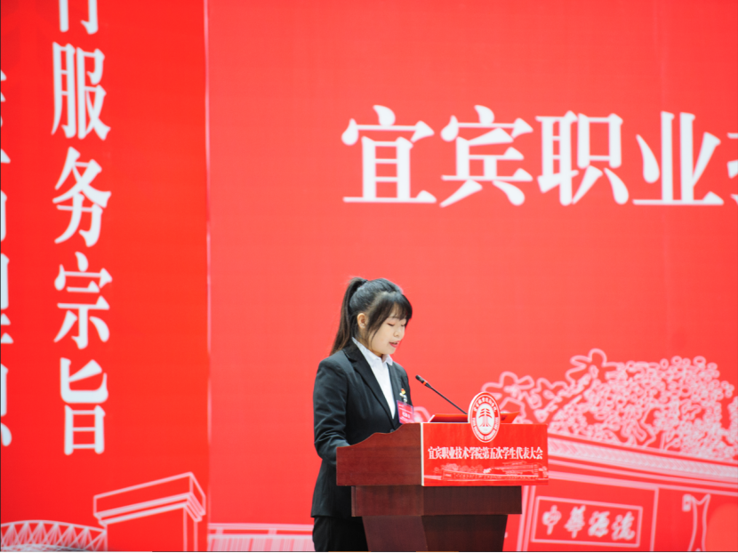 康松艺同学代表宜宾职业技术学院学生会第四届主席团向大会作了题为《学习党的二十大精神、永远跟党走、奋进新征程,在全面建设社会主义现代化国家、全面推进中华民族伟大复兴的火热实践中贡献青春力量》的报告。大会还听取了《宜宾职业技术学院第四届学生会提案工作报告(草案)》,审议了《宜宾职业技术学院学生会章程修正案(草案)》。