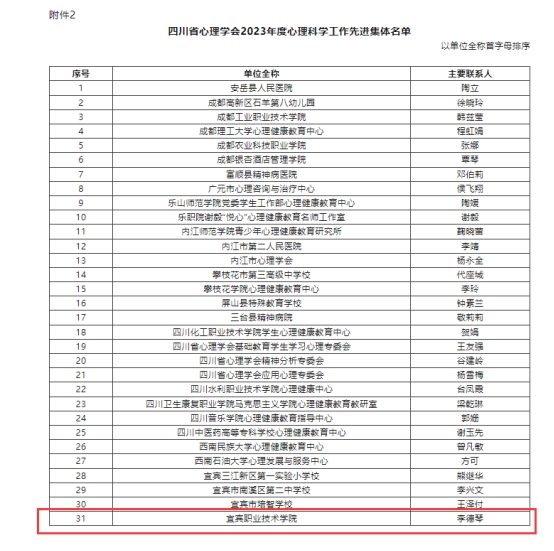 近日,四川省心理学会发布了关于2023年度心理科学工作先进个人和先进集体评选结果的公示,我院在此次评选中荣获“四川省心理学会2023年度心理科学工作先进集体”称号。