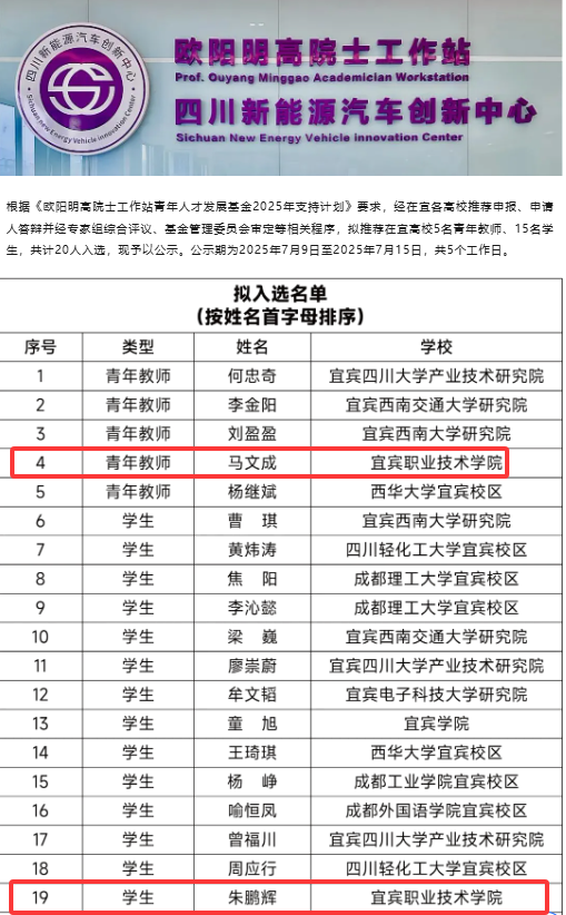 此次基金资助是根据《欧阳明高院士工作站青年人才发展基金2025年支持计划》要求,经在宜各高校推荐申报、申请人答辩、专家组综合评议及基金管理委员会审定等相关程序,共推荐在宜高校5名青年教师、15名学生,共计20人入选。