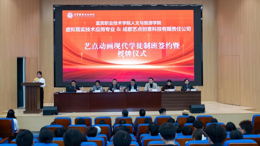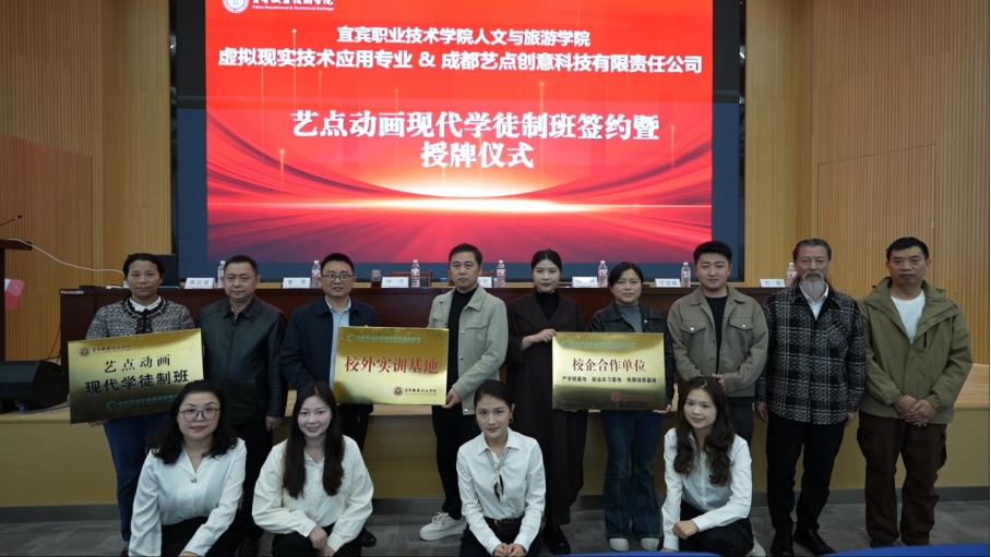 11月7日,我校人文与旅游学院与成都艺点创意科技有限责任公司(以下简称“艺点动画”)在厚德楼报告厅举行现代学徒制合作协议签约仪式。双方将在虚拟现实技术应用专业领域开展深度合作,共同探索“现代学徒制”人才培养新模式,为元宇宙、数字文旅等新兴产业输送高技能人才。